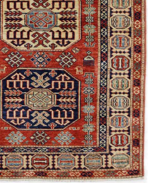 This carpet is woven in Pakistan. The patterns are inspired by Russian geometric patterns and the wool used is made from natural vegetable dyes. The size is 150 x 98 cm