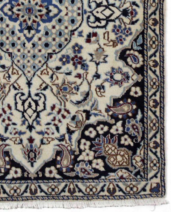 This carpet is knotted in workshops in Nain near Isfahan (Iran). The size is 135 x 87 cm. The carpet is generally very light with a cream-coloured or deep-blue bottom colour and a large medallion in the centre.