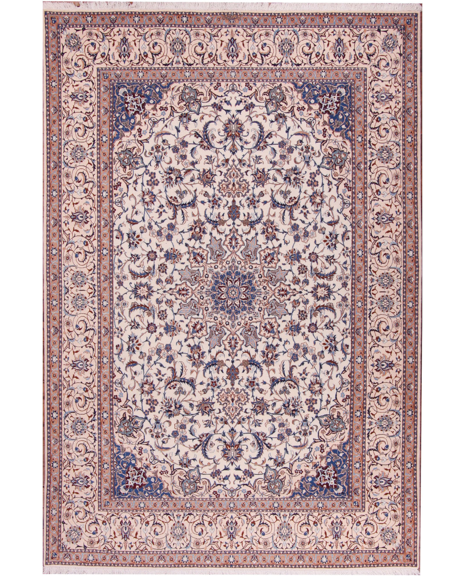 This carpet is knotted in workshops in Nain near Isfahan (Iran).The size is 300 x 200 cm.The carpet is generally very light with a cream-coloured or deep-blue bottom colour and a large medallion in the centre.With a high density of knots and high class material, these carpets are very popular among collectors.This fine Nain bears the Habibian signature.